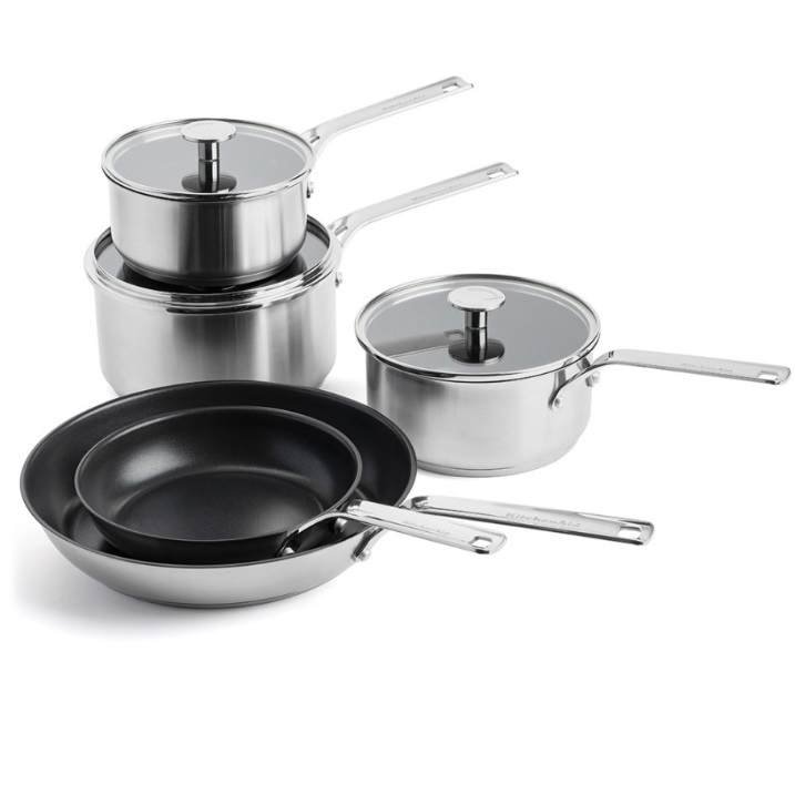 Набір посуду із каструль з кришками з нержавіючої сталі з антипригарним покриттям 16/18/20 см і клмплектом сковорідок 20 + 28 см нержавіючої сталі з антипригарним покриттям з вигнутим бортиком для легкого наливання без крапель.Можна використовувати в духовці при температурі до 220°C, включаючи кришки. Можна мити в посудомийній машині для легкого очищення. Цей набір посуду підходить для всіх типів плит, включаючи індукційні.