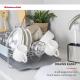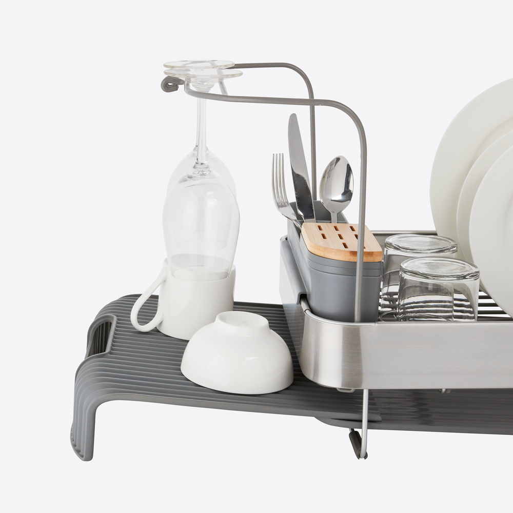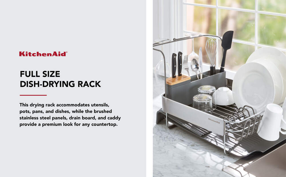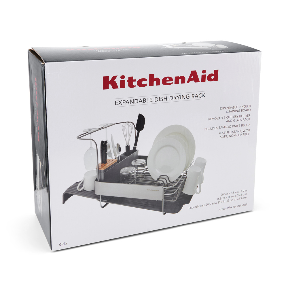 Стильно організуйте свою кухонну мийку за допомогою розширюваної решітки для сушіння посуду KitchenAid сірого вугільного кольору. Надзвичайно проста у використанні, просто потягніть за ручку, щоб розсунути додаткову дошку для сушіння посуду та отримати додаткову площу для сушіння. Виготовлена з нержавіючої сталі, стійкої до іржі, сушарка також оснащена м'якими нековзними ніжками, щоб не пошкодити вашу поверхню. Нахилена під кутом дошка для зливу спрямовує воду назад у раковину, а також є додаткове кріплення для скляного посуду, щоб безпечно повісити келихи для вина. Вміщує 11 тарілок, 6 чашок і 4 фужери. Достатньо лише ручного миття.