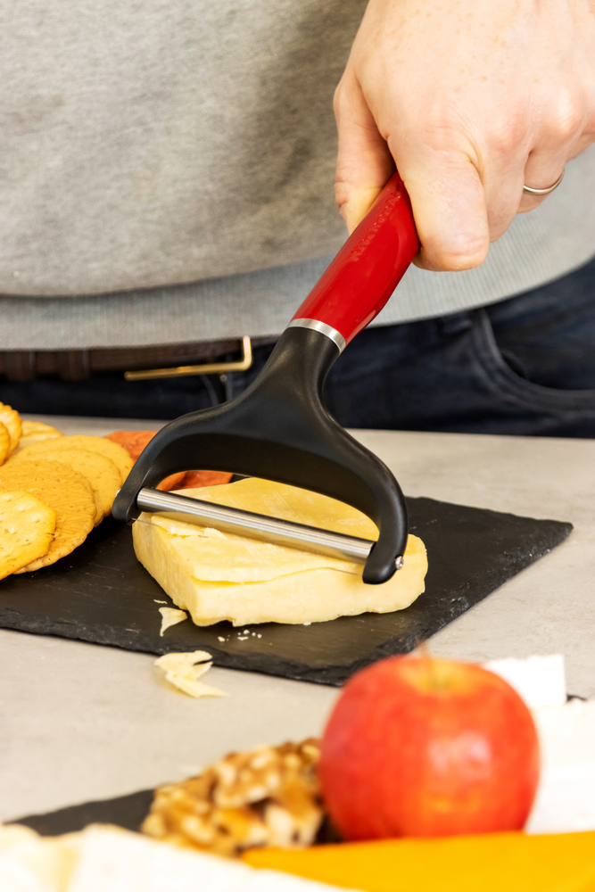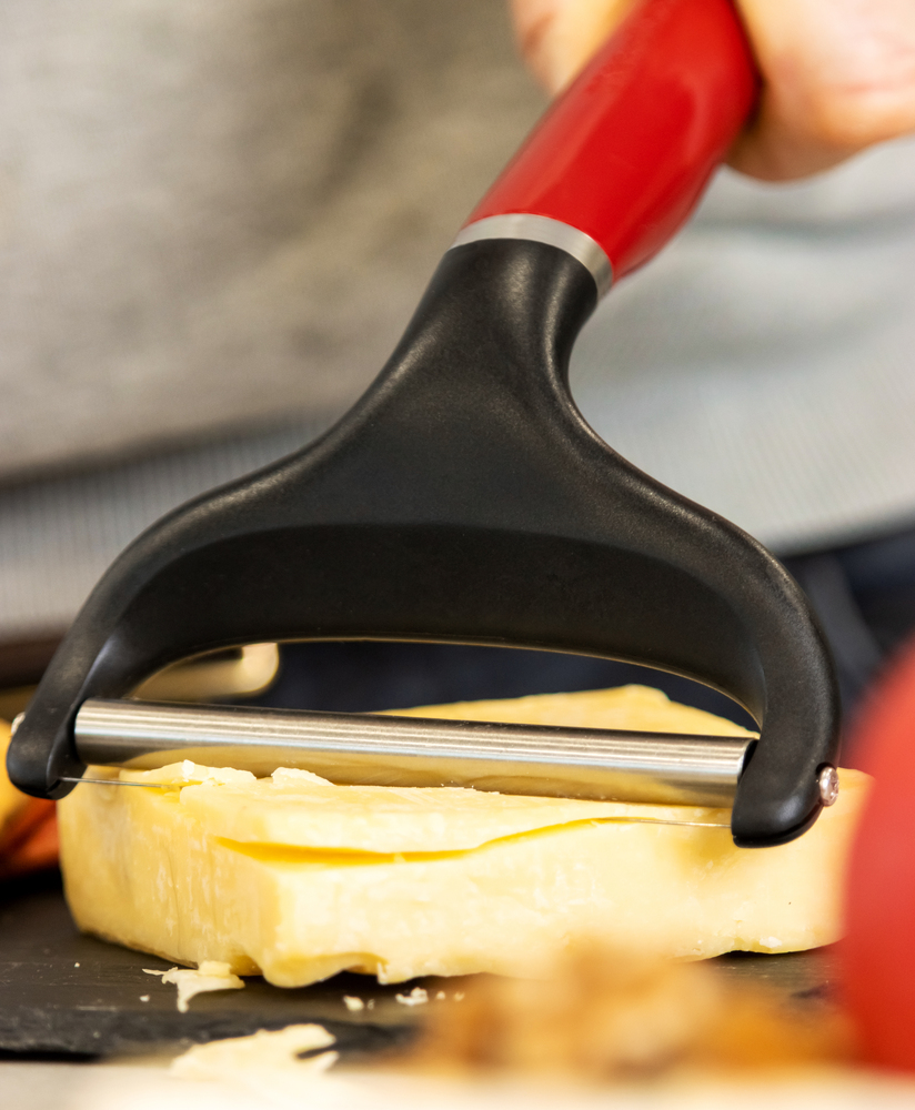 Подайте на наступній вечірці асортимент вишуканих сирів за допомогою цього ножа для сиру від KitchenAid. Надміцний дріт з нержавіючої сталі легко нарізає тверді та напівм'які сири. Все, що вам потрібно зробити, це провести ломтерізкою по поверхні, щоб отримати шматочки рівномірного розміру. Ручка добре збалансована та ергономічна для комфортної та плавної роботи. Має глянцеве покриття, рельєфний логотип і хромовану підставку. Можна мити в посудомийній машині для легкого очищення.